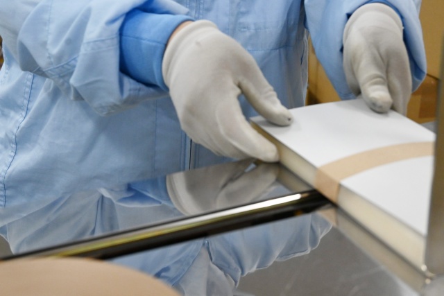 外部からゴミ、ホコリ等を持ち込まないようエアシャワーを設置。毛髪などが入りこまない様に最新の注意を払い、日々の作業に取り組んでおります。